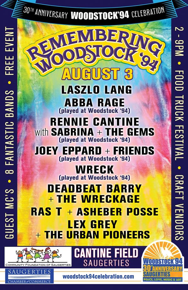 A day of music and fun for the entire family at Cantine Field, 207 Market Street in Saugerties, NY. Starting at 2pm, the groups scheduled to perform include local groups, with FOUR of these groups having played at the original Woodstock ’94 (Joey Eppard and Friends, WRECK, Abba Rage, and Rennie Cantine). We also have performances by Ras T and Asheber Posse, Deadbeat Barry and the Wreckage, Lex Grey and the Urban Pioneers and Laszlo Lang. Also featuring Guest MC's and more.