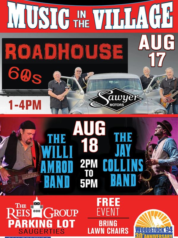 Two afternoons of music at the Reis Insurance Company Parking lot in Saugerties. On Saturday, August 17, from 1-4pm, dance your heart away with the music by Roadhouse playing your favorite tunes. Brought to you by Sawyer Motors. On Sunday, August 18, from 2pm - 5pm, enjoy music by two acclaimed bands, the Willie Amrod Band and the Jay Collins Band. A perfect way to spend a Sunday Afternoon. FREE Admission.