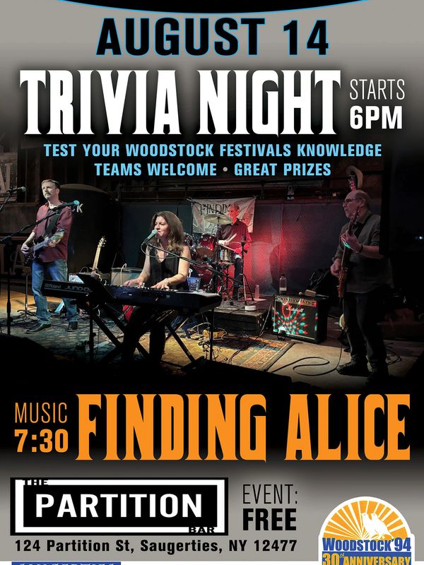 On Wednesday, August 14, there will be a trivia contest focusing on all things Woodstock hosted by Terry McCann. There will be great prizes, so come as a team if you want. Following the Trivia contest there will be live music by Finding Alice at The Partition, 124 Partition Street, Saugerties.