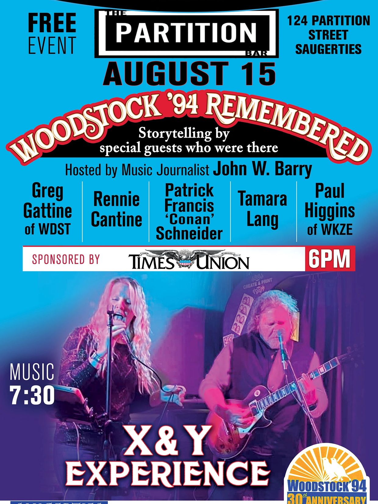August 15- Enjoy discussion about Woodstock ‘94 from those who were there, brought to you by Times Union followed by live music by the X&Y Experience at The Partition. Evening starts at 6pm. Free