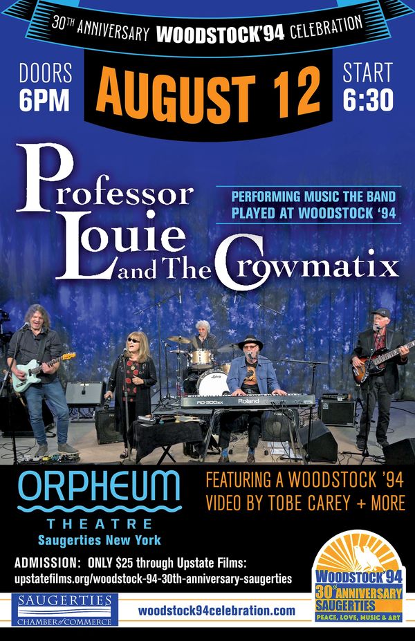 A night of remembrance and music at the Orpheum Theater, 253 Main Street, Saugerties. The Woodstock ’94 30th Anniverary Celebration kicks off a week-long celebration with a screening of Woodstock Summer of '94: Not the Music ...Just the Scene, a video by noted, local filmmaker, Tobe Carey followed by a live concert by Professor Louie & The Crowmatix performing songs by The Band (who played the longest set at the festival).